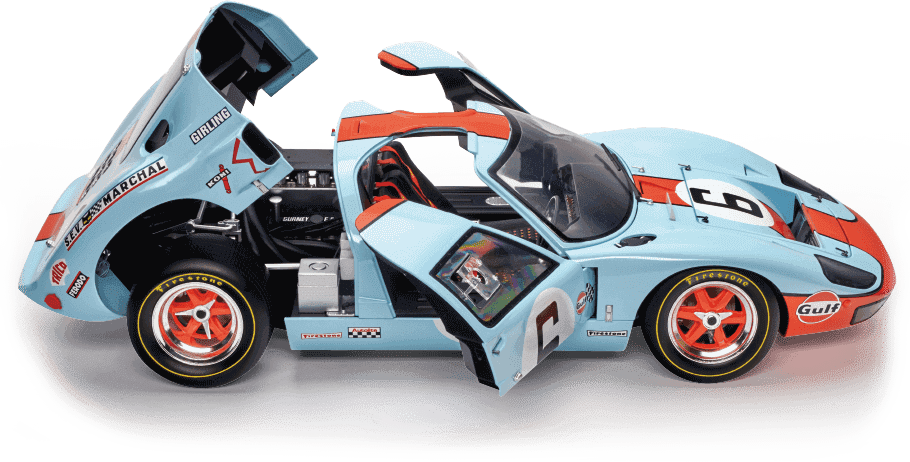La Ford GT 40 remporta les 24 Heures du Mans à 4 reprises, entre 1966 et 1969. Aujourd’hui encore, c’est un modèle qui fascine. À l’époque, Henry Ford souhaitait une voiture capable de battre les Ferrari sur circuit. Le pari fut donc remporté. Intéressons-nous maintenant à la Ford GT 40 des éditions Altaya, à l’échelle 1/8. Longue de plus de 50 centimètres et lourde de 8 kg, c’est une miniature imposante. Elle est à assembler par vos soins, grâce à 110 numéros. Pas besoin de compétence spécifique, les pièces arriveront déjà peintes et prêtes à être montées. Cette maquette est inédite à cette échelle !