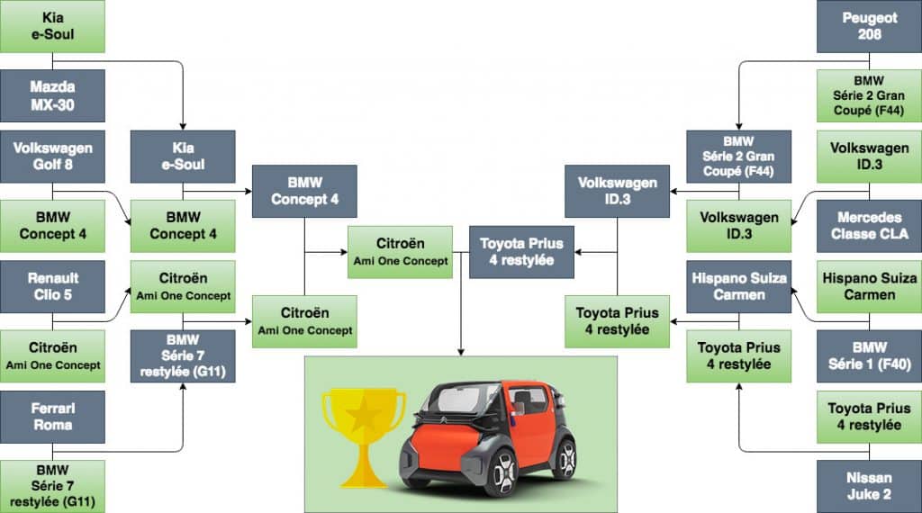 Pendant deux semaines, nous avons organisé un tournoi afin de déterminer quelle était la voiture la plus laide de l’année 2019. Nous ne sommes intervenus à aucun moment, tant dans la sélection des véhicules que dans les votes, tout s’est déroulé sur notre page Facebook. En parallèle, nous tenions cet article à jour, qui vous a permis de suivre l’évolution des duels. Parmi les 16 voitures que vous avez le plus mentionné, les duels ont été sans pitié. Un modèle a tiré son épingle du jeu et battu tous les autres, sans difficulté, c’est la Citroën Ami One Concept.