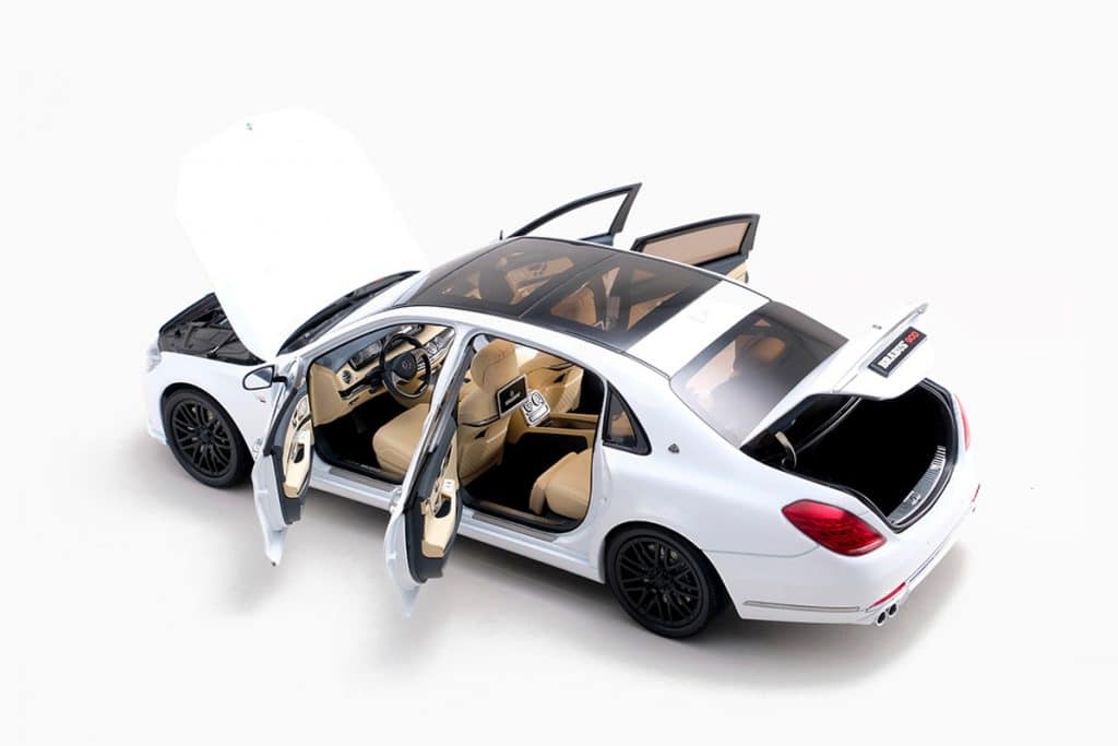 Imaginez donc… Une routière de luxe préparée par Brabus… C’est exactement ce modèle que nous propose Almost Real. La base n’est autre que la dernière Mercedes Classe S en version Maybach, reconnaissable à son empattement allongé, son intérieur encore plus luxueux et un moteur V8 de 463 chevaux. Comme à chaque nouvelle création, Almost Real propose une miniature d’une excellente qualité. La Brabus 900 y est reproduite avec un souci du détail impressionnant. On retrouve tous les attributs de cette version Brabus qui abandonne le V8 au profit d’un V12… poussé à 900 chevaux. La calandre est finement reproduite tout comme les optiques au design sophistiqué. On apprécie la présence de tous les ouvrants (4 portes, capot, coffre), les jantes très détaillées, l’intérieur très bien retranscrit avec de beaux ajustements et même la présence d’aérateurs aux grilles apparentes.