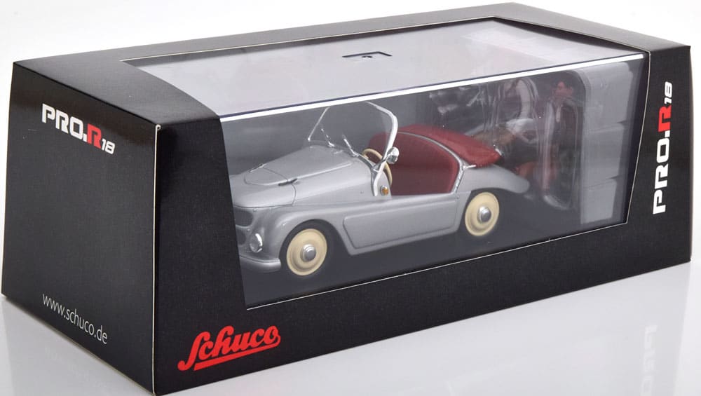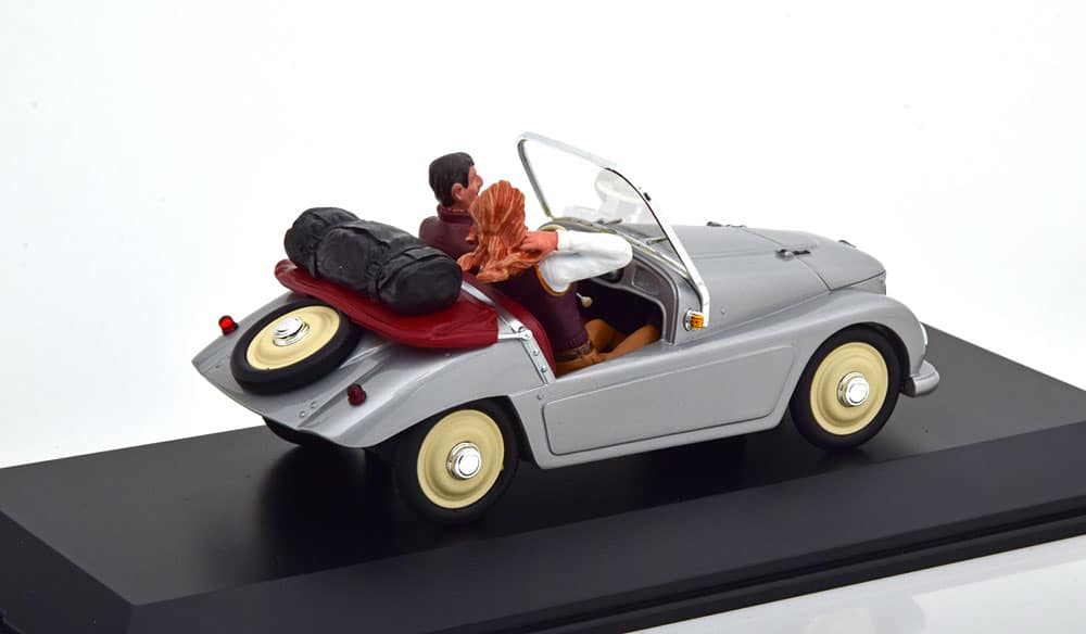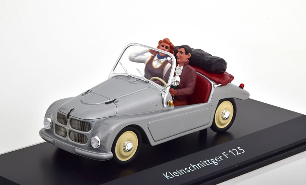 Chez PDLV, on aime bien les voitures assez atypiques. Aujourd’hui, nous avons repéré une belle affaire à réaliser en ce moment-même sur CK Modelcars et Modelissimo. La Kleinshnittger F 125 est un petit cabriolet au nom complexe, qui fut vendu dans les années ’50. La branche haut de gamme de Schuco, Pro.R, s’est accaparée cette mignonne petite voiture. Au programme, une réplique fidèle à l’échelle 1/18, en résine. On note une belle couleur gris clair et des jantes de couleur crème. À l’arrière, sur le couvre-capote, on trouve un sac de voyage plutôt réaliste. À bord de la voiturette de 6 chevaux pour 150 kg, vous pourrez y placer un homme et une femme. Ce couple est assez bien reproduit dans l’ensemble. Pour seulement 39,95 €, cette miniature apportera une touche d’originalité dans votre collection et ne manquera pas d’interroger ceux qui la découvriront ! Référence : 450015900.