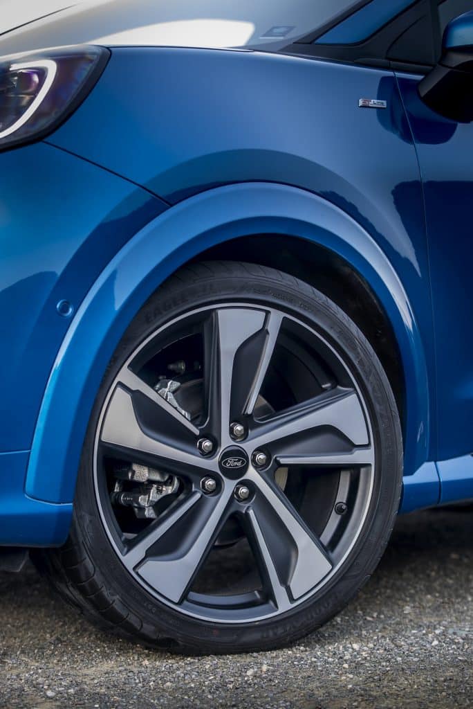 Beaucoup de SUV cherchent à gratter un design de sportive tout en conservant les attributs d’un SUV. Généralement, cela ne fonctionne pas. Ici, le Ford Puma ne trahit nullement la hauteur de sa ceinture de caisse, mais compense via un hayon très plongeant, ainsi que des portières creusées. Enfin, les jupes latérales, les arches de roues peintes en couleur carrosserie (et pas en noir laqué, n’est-ce pas Madame 208 ?) et les jantes bi-ton mattes en 19 pouces contribuent aussi à la sportivité du profil.