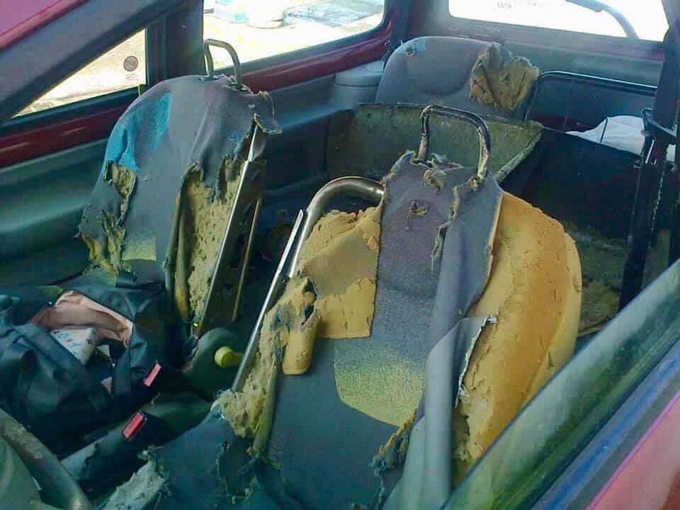 Les gros chiens ont bon appétit. Cette Renault Twingo de première génération en a fait les frais. Une chose est certaine : je n’aimerais vraiment pas croiser ce chien dans la rue, sans muselière. Heureusement, on trouve pléthore de Twingo 1 en casse et le remplacement de la sellerie ne reviendra pas très cher. En revanche, le risque de contre-visite est multiplié par au moins 12.