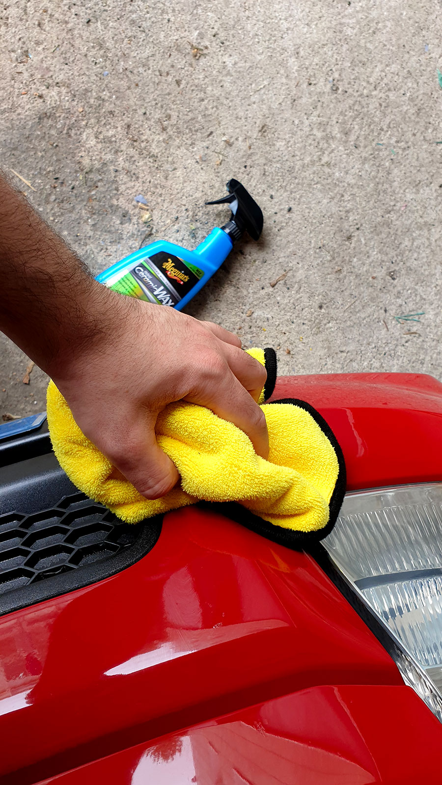 Pour la première application, il faut travailler depuis une base humide ou sèche et vaporiser généreusement le produit après l’avoir secoué. Ensuite, on lustre à l’aide d’une microfibre jusqu’à ce que la surface soit parfaitement lisse. Et là, vous vous sentirez comme dans un magasin de bonbons. L’odeur du produit est très addictive et je n’ai aucun doute que l’intérêt du produit vienne aussi de son odeur pour certains. L’application est donc rapide et simple. N’ayez crainte : lors de la première utilisation, un bon tiers du flacon risque d’y passer mais ce ne sera plus le cas après. Pour les fois suivants, il suffit de laver son véhicule, de vaporiser le Meguiars Hybrid Ceramic Wax sur la carrosserie puis de rincer directement au jet. Le produit se répartira alors sur la carrosserie et activera sa protection. Bluffant de simplicité et d’efficacité.