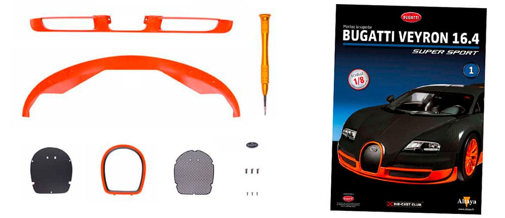 Pour vous inciter à vous abonner, les éditions Altaya proposent le premier numéro de la collection au prix de 0,50 €. Pour cette somme dérisoire, vous disposerez de quelques pièces : la lame avant, le bas de pare-choc avant, l’entourage de calandre et sa grille ainsi que le le logo avant, six vis et un tournevis. À cela s’ajoute bien sûr un petit tournevis. C’est donc une mise en bouche plutôt attrayante bien que l’on prenne aussi rapidement conscience que pour assembler intégralement cette Bugatti Veyron Super Sport 1/8, il va falloir pas mal de numéros !