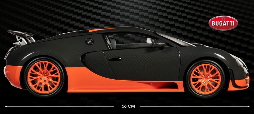 Annoncée initialement chez Eaglemoss, c’est donc Altaya qui sortira sa réplique de la Bugatti Veyron 16.4 Super Sport, à l’échelle 1/8. La première chose que l’on remarque, sur les photos du prototype, c’est le rendu du carbone, qui est ici brillant. Bien qu’il ne s’agisse pas réellement de carbone, l’aspect semble vraiment très bon, avec un tissage réaliste et bien séparé le long de la caisse, d’avant en arrière. Les parties orange sont jolies, tout comme les grilles en photo-découpe qui sont fines et ajoutent du réalisme. On note que tous les ouvrants le sont réellement, aussi bien la baie moteur, que les portes, le coffre avant et l’aileron rétractable. La reproduction du moteur W16 est aussi judicieusement retranscrite. On note que les roues sont orientables avec le volant, que les sièges sont rabattables et que les phares et feux stop pourront réellement s’allumer. L’intérieur est aussi très bien modélisé.