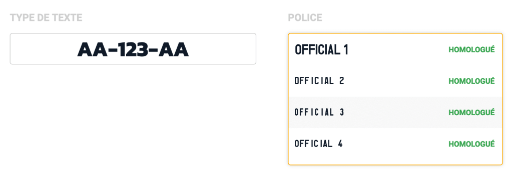 Plusieurs polices d’écritures peuvent être choisies sur votre plaque d’immatriculation… Mais tout n’est pas légal pour autant. Seules les polices dites « bâton » sont permises, ce qui signifie qu’elles ne doivent pas avoir d’empattements ni même être de type fantaisie. Cela permet toutefois de se rapprocher plus ou moins des caractères allemands ou anglais, ce qui peut donc donner du caractère à votre modèle de plaque d’immatriculation. Cela exclue donc l’indécrottable Comic Sans MS !