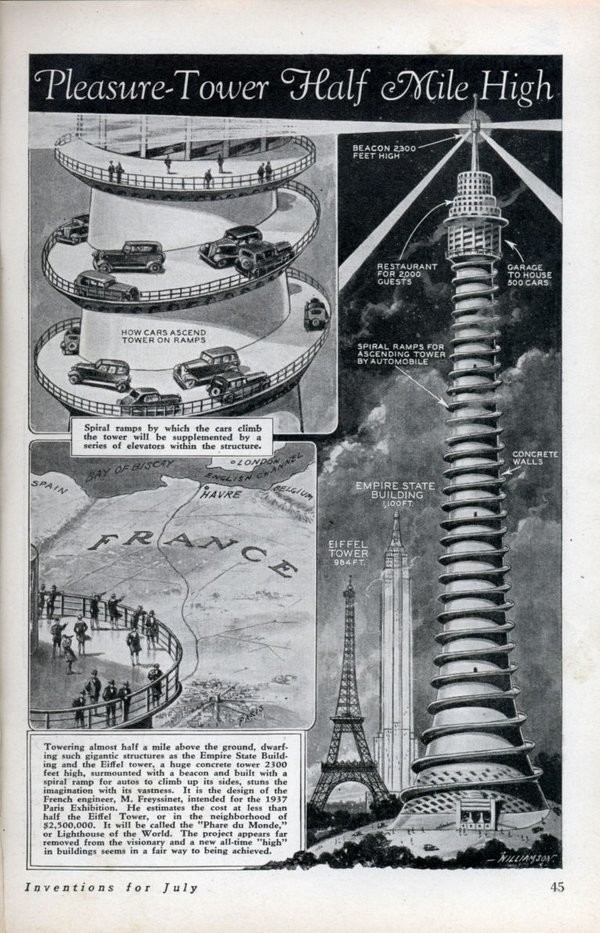 Et c’est loin d’être le seul projet « audacieux » qui a fait fantasmer les ingénieurs et architectes. D’autres ont voulu voir encore plus grand. C’est par exemple le cas du Phare du Monde, présenté à l’occasion de l’Exposition Universelle de 1937, par Eugène Freyssenet. Là encore, l’automobile prend pleinement place au sein de ce projet.