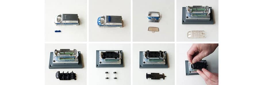 Maintenant que les pièces sont préparées, il faut encore les assembler ! D’une manière générale, cela représente entre 5 et 20 pièces en fonction des modèles. Cet assemblage peut être réalisé à la main ou effectué à l’aide de machines. La dernière étape consiste à sceller la miniature afin qu’elle ne puisse pas être ouverte par les enfants.