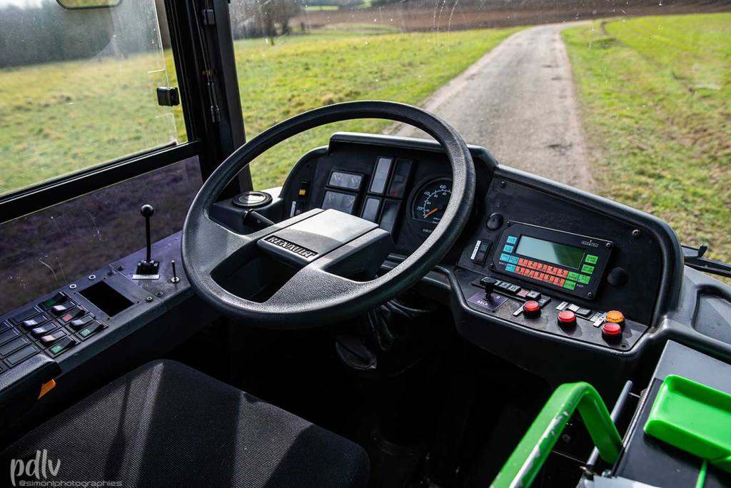 Prenons maintenant la meilleure place : celle du conducteur. Pour y accéder, nous disposons d’une porte qui permet d’isoler le poste de conduite. Celle-ci s’ouvre assez facilement grâce à une gâchette. On monte alors deux petites marches avant de prendre place dans le fauteuil. Là, on remarque tout de suite une différence de traitement : le conducteur dispose d’un siège moelleux et rembourré. Il y a même un petit accoudoir mais pas d’appuie-tête. On domine la route et on dispose d’une excellente visibilité, aussi bien sur l’extérieur qu’à l’intérieur. Différents miroirs permettent de voir l’ensemble des passagers. De prime abord, c’est un tableau de bord plutôt complexe, avec une multitude de commandes. L’âge de ce bus, qui date de 1995, se ressent clairement avec des boutons à l’ancienne et des formes très strictes. On dispose même d’une fenêtre coulissante sur notre gauche. Sans être luxueux, c’est un habitacle fonctionnel.