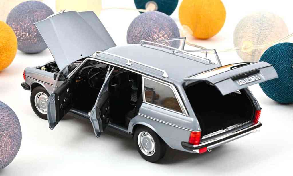 Les « Exclu Web » reviennent régulièrement chez Norev. Concrètement, il s’agit ainsi de la reprise de modèles déjà existants, dévoilés dans une nouvelle configuration colorée, elle-même produite en tirage limité. Cette fois, il s’agit de la Mercedes de type S123 à l’échelle 1/18. C’est donc d’un break routier (ancêtre de la Classe E), dans son second restylage, millésime 1982. Cette fois, le coloris de cette édition limitée est on ne peut plus classique : un gris métallisé avec une pointe de bleu (Silverblue). Une teinte neutre qui met toutefois bien en valeur les lignes de ce joli break. Par ailleurs, Norev a reproduit aussi bien les versions berline (W123) que break (S123) en version 200 T. C’était la motorisation d’entrée de gamme, à savoir un moteur essence 4-cylindres de 2.0 litres offrant 109 chevaux.