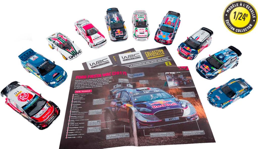 Cette collection met à l’honneur les voitures de rallye engagées dans la discipline reine : le World Rally Championship, organisé chaque année par la FIA. C’est une succession de courses très techniques où s’affrontent les meilleurs pilotes. Afin d’augmenter l’impact et la visibilité de cette collection, les éditions Hachette ont retenu des miniatures représentatives. À l’échelle 1/24, on trouvera donc la Ford Fiesta WRC de Sébastien Ogier, la Citroën C3 WRC de Sébastien Loeb, la Volkswagen Polo R WRC de Jari-Marri Latvala ou encore la Lancia Delta Integrale 16V de Miki Biason. Les modèles réduits rendent assez bien hommage aux originaux. On apprécie notamment la présence de quelques grilles perforées. Pour l’heure, les éditions Hachette ne communiquent que sur les 10 premiers numéros. Par rapport à l’annonce du test, quelques modifications dans l’ordre d’apparition ont eu lieu.