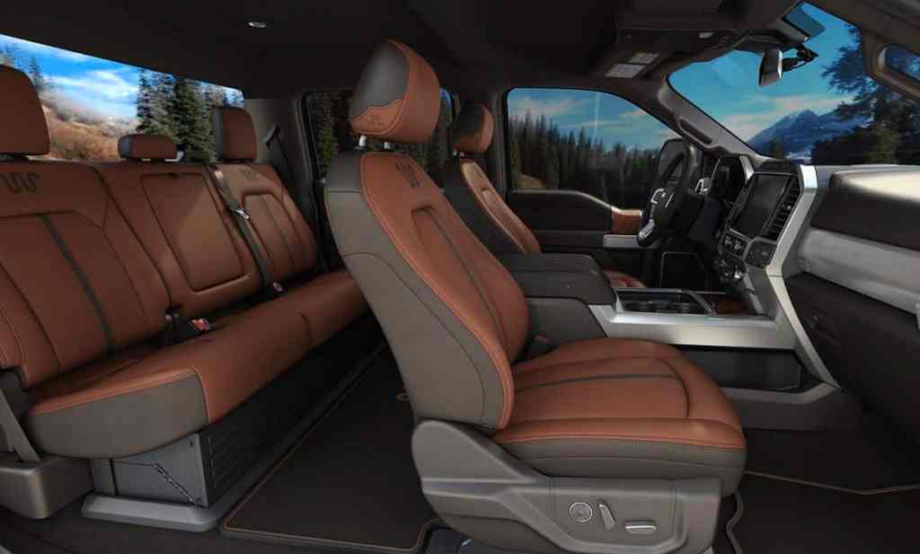 Au niveau du style, c’est très bestial. La calandre est encore plus massive sur le millésime 2022. On trouve des codes directement empruntés aux camions. C’est par exemple le cas des jantes, des rétroviseurs ou encore de détails de finition. Néanmoins, Ford a fait beaucoup d’efforts pour renforcer l’aspect séduction du F-450 King Ranch. Le nouveau modèle bénéficie toujours d’une grande cabine 6 places en haut de gamme. Le marche-pied latéral est désormais de série, ce qui s’avèrera utile notamment pour les enfants. Pour les manœuvres, il faudra mieux prendre son temps. Rétroviseurs compris, la largeur du monstre est de 2,69 mètres. C’est plus qu’un bus. Pourtant, le succès de la branche Super Duty est indéniable. Depuis son lancement en 1998, elle n’a cessé d’évoluer, allant même proposer une version F-550 – en réalité un camion – qui a pu bénéficier d’aménagements particuliers. Bref, la démesure n’a aucune limite.