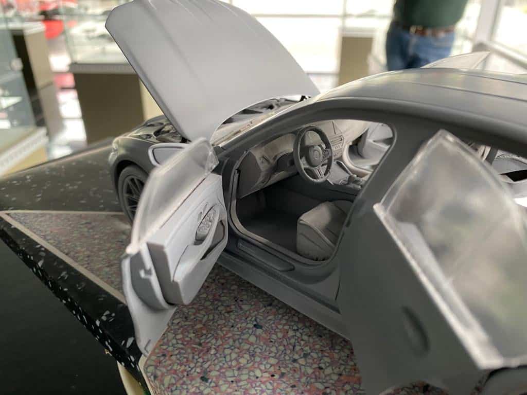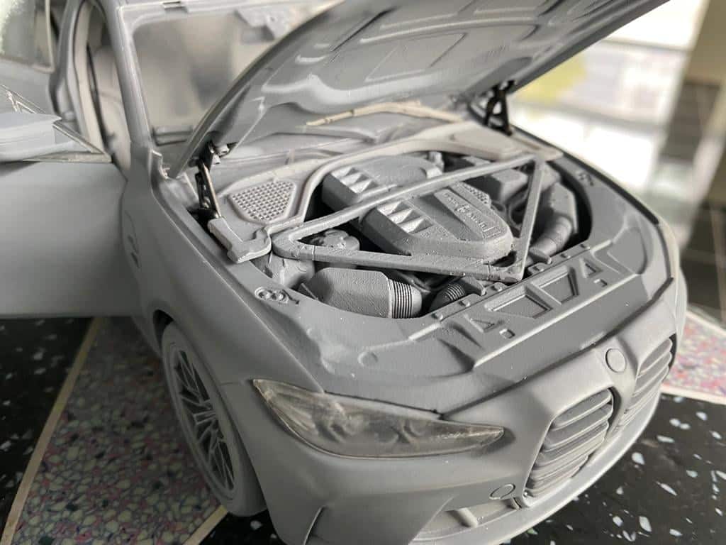 C’est la vrai bonne nouvelle ! Ces clichés nous permettent d’observer une première maquette en métal, de ces futures BMW M3 et M4. Pour rappel, ces versions sportives des Série 3 et Série 4 reçoivent un moteur 6-cylindres biturbo offrant 510 chevaux. En France, seule la version Compétition est proposée au catalogue. Pour ces miniatures 1/18, on apprécie réellement la présence de tous les ouvrants. Une très bonne nouvelle et un choix qui portera ses fruits pour Minichamps, sans nul doute. À l’échelle 1/18, c’est toujours appréciable de pouvoir découvrir l’intérieur de plus près. Toutes les portes sont ouvrantes, ainsi que le capot qui disposera de ses propres charnières et bien sûr le coffre. L’intérieur est déjà modélisé, mais sans finition, il est difficile d’apprécier pleinement ce qui nous sera proposé. Minichamps visera une finition plutôt haut de gamme, avec notamment de la feutrine au sol.
