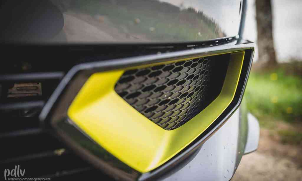 Un seul regard suffit pour différencier la Peugeot 508 PSE des autres 508. L’identité sportive de la marque au lion se perçoit assez vite (avec notamment les crocs lumineux à l’avant). Déjà, le gris Selenium est une teinte exclusive, c’est un gris intermédiaire métallisé, qui se rapproche quelque peu du gris Nardo de chez Audi. Il est aussi possible de choisir une teinte blanche ou noire. Soyons clairs : le catalogue de couleur est donc particulièrement restreint. Ces trois couleurs ont l’avantage de bien mettre en valeur les touches Kryptonite, que l’on perçoit notamment sur la partie inférieure du pare-choc. Un pare-choc légèrement redessiné, qui accueille donc les fameuses canules colorés. La calandre arbore un motif façon fibre de carbone mais contrairement au concept-car, elle n’est plus imprimée en 3D !