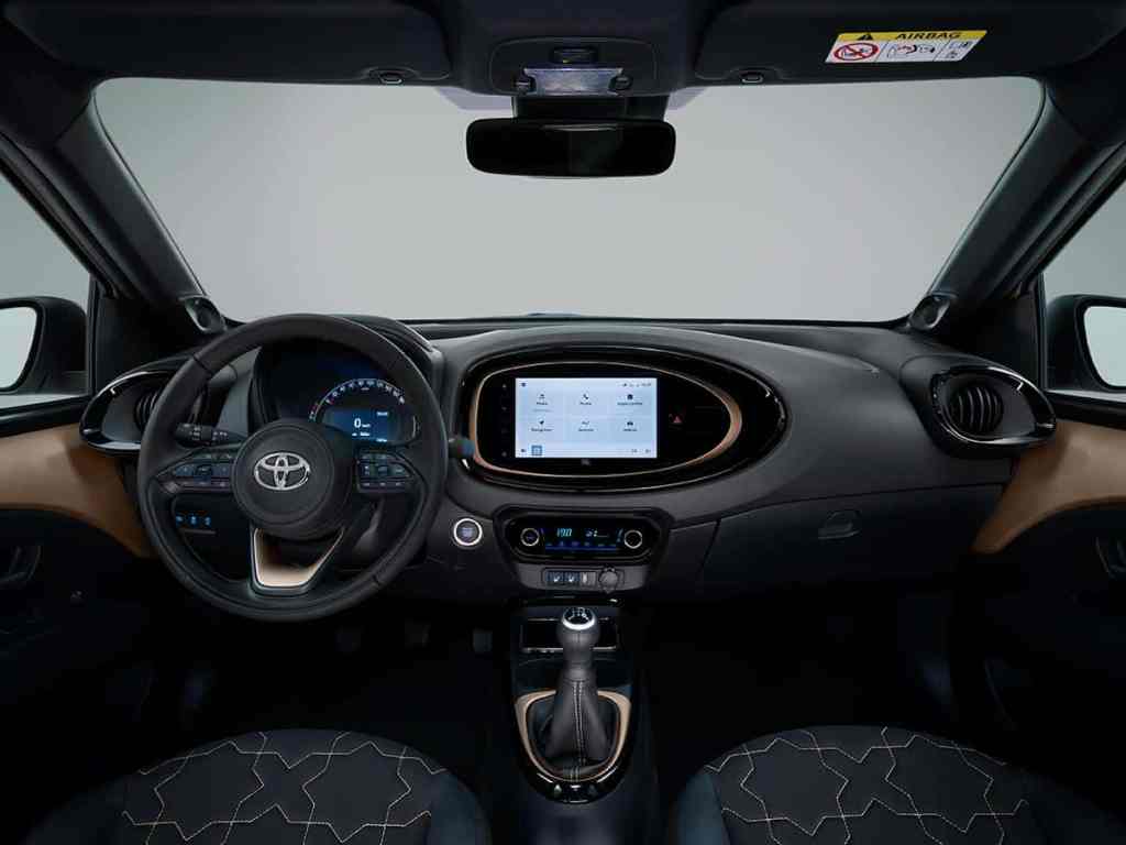 Les designers, lorsqu’il s’agit d’une mini-citadine, se doivent d’aller à l’économie dès qu’ils le peuvent. Ainsi, le travail de l’habitacle a majoritairement été concentré sur les parties les plus visibles. Et l’habitacle de cette Toyota Aygo X semble plutôt agréable. Bien qu’il s’agisse d’une finition haute sur les photos, on découvre un écran de 9 pouces joliment intégré au centre (7 pouces en entrée de gamme). L’instrumentation est partiellement numérique tandis qu’un éclairage d’ambiance est intégré tout comme un système audio de 300 W. Mais surtout, il est possible d’agrémenter l’habitacle de touches orangées, qui égaient largement l’ensemble.