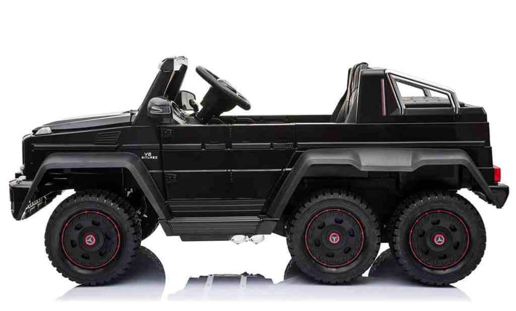 Sa particularité, c’est qu’il s’agit de la version 6×6, qui existe réellement à l’échelle 1 et qui est ici miniaturisée afin de pouvoir accueillir deux enfants à son bord. À l’échelle 1/4, cette voiture électrique pour enfant retranscrit assez bien les lignes bestiales du pick-up allemand de luxe. On retrouve la belle calandre, ses optiques à LED, un pare-choc volumineux et un profil lui aussi très bien réalisé. Le plus marquant, c’est bien sûr qu’il s’agit d’un modèle à 6 roues. Ce type de conception est assez rare dans le domaine.