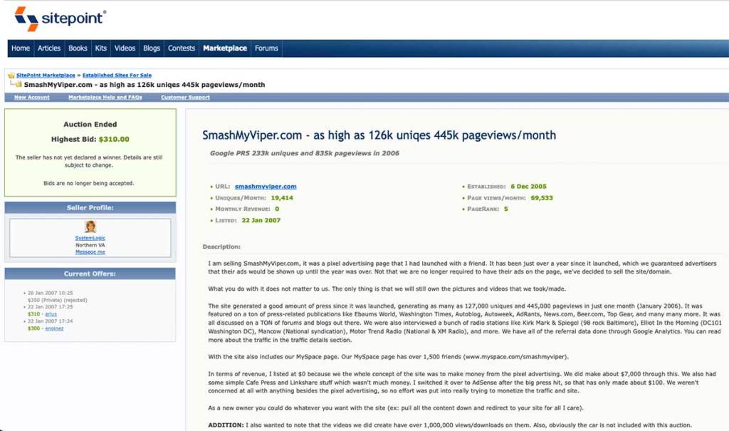 Le site connait une baisse drastique de ses visiteurs et pour limiter la casse, une mise aux enchères est organisée sur SitePoint, qui consacrait alors une rubrique dédiée aux sites web à vendre. Le trafic du site est estimé à 19 414 visiteurs mensuels, ce qui est relativement bas. À l’inverse, Smash My Viper dispose d’un PageRank de 5. Cet ancien indice de Google classifiait les sites avec une note de 0 à 10. Un score de 5, c’est tout à fait respectable.
