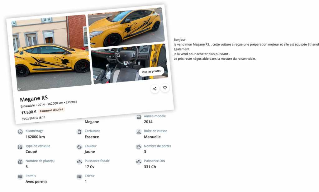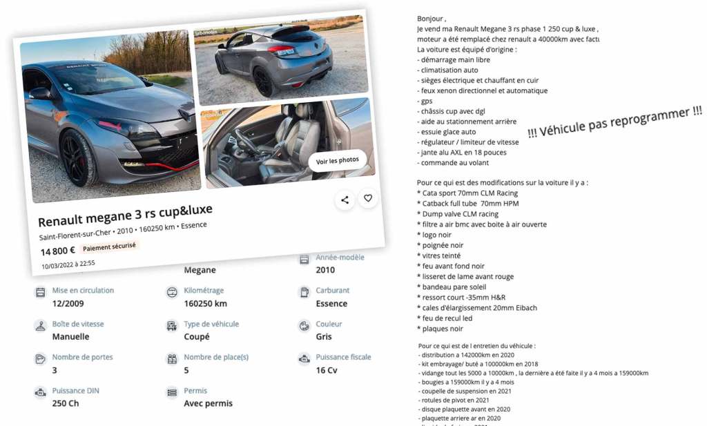 Terminons sur une annonce qui illustre bien tout ce qu’il faut fuir. Outre les stickers sur la carrosserie, il s’agit d’un modèle avec la conduite à droite (RHD), ce qui devrait engendrer une décote plus importante. Mais surtout, l’année semble peu cohérente, tout comme la vignette Crit’Air annoncée… De plus, l’annonce est très maigre en information et le propriétaire dit « MON Mégane »… Un signe qui n’annonce généralement rien de bon, tout comme la préparation moteur et la raison de la vente. En bref, il vaut mieux passer son chemin…