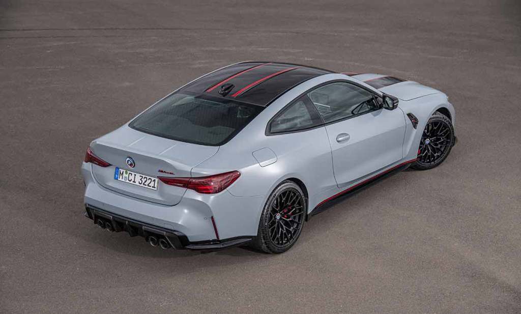 Déjà, on remarque une livrée exclusive gris mat, bien qu’il sera aussi possible de choisir du blanc ou du noir. On notera également une calandre redessinée, largement plus ajoutée et parée d’un cerclage rouge. À cela s’ajoute un gimmick, le toit en fibre de carbone. Cela est déjà disponible sur la M4 Compétition, afin d’abaisser le centre de gravité. Pour autant, la M4 CSL va plus loin en adoptant des panneaux de carrosserie en carbone peint mais également du CFRP (plaque renforcé carbone). On notera une lame avant proéminente en carbone, un kit décoratif noir et rouge (retirable gratuitement), des jantes exclusives en 19 et 20 pouces et un aileron queue de canard très réussi. Le diffuseur est également nouveau tout comme les écopes d’entrée d’air.