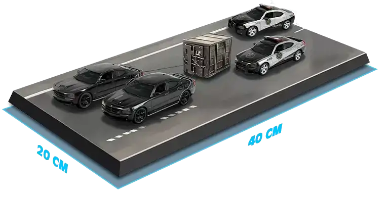 Envie d’approfondir la collection ? Altaya vous propose de souscrire à une offre Premium. Celle-ci comprend un diorama représentant une scène mythique de Fast & Furious 5. On y voit les Dodge Charger SRT-8 de Dom et Bryan tracter un immense coffre de banque. Derrière, deux autres Dodge Charger de Police. On appréciera le soin apporté à ce diorama, avec des particularités pour chacune des quatre voitures. En acceptant de verser un supplément de 1,40 € par numéro à partir du numéro 4, vous recevrez les différents éléments de ce diorama avec vos envois n°16 et 24.