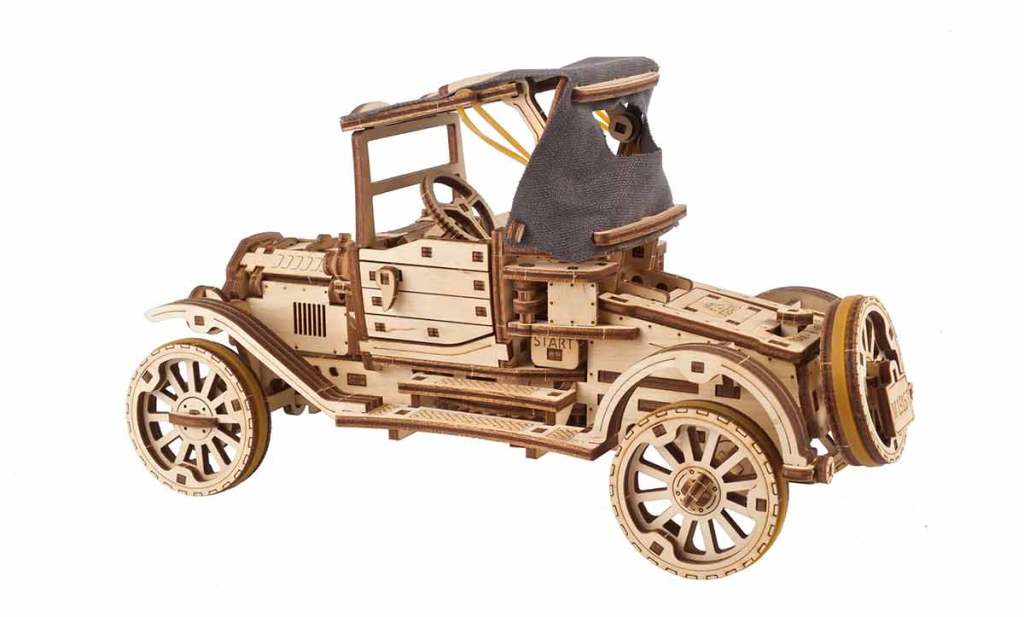 On poursuit avec une élégante voiture ancienne des années ’20 ou ’30. Celle-ci est également joliment reproduite, avec de baux détails. Elle inaugure une inédite capote en toile, ce qui ajoute un rendu très chic. Le modèle dispose d’un moteur 4-cylindres fonctionnel, que l’on active par le biais d’une manivelle. Le modèle peut également rouler sur terrain plat. Longue de 26,5 centimètres, cette voiture rétro compte 337 pièces et nécessite 7 heures de montage. Vous pouvez dès à présent la commander sur le site du fabricant au prix de 49,90 €. Une somme bien placée pour ce superbe puzzle en bois. Référence : 70175.