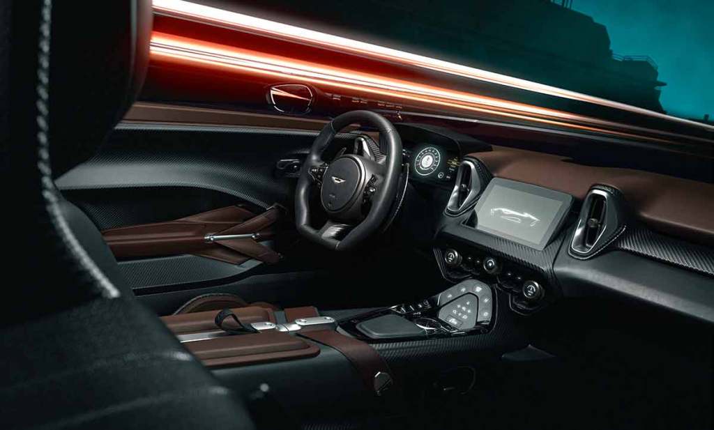 La marque a fait le choix de réduire le nombre de panneaux de carrosserie pour épurer la ligne. Cela aboutit sur un immense capot avant qui peut sans doute basculer, comme à l’époque. On notera d’ailleurs que contrairement à bon nombre de concurrentes, l’Aston Martin DBR22 conserve son moteur en position avant. Les ailes sont superbement galbées, avec un élégant renflement au niveau des portes et des bas de caisse en fibre de carbone. L’ensemble participe à la réduction de la masse bien qu’Aston Martin n’ait pas communiqué sur ce point. On trouve aussi un très bel intérieur qui mêle du cuir marron à de la fibre de carbone. Si une carrosserie speedster est souvent synonyme de légèreté, la DBR22 semble avoir voulu conserver un bon niveau de confort. D’ailleurs, au même titre que la McLaren Elva, l’Aston Martin DBR22 dispose toujours d’un écran tactile central.