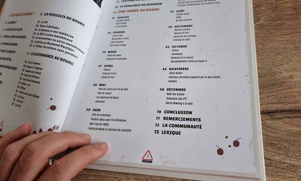 C’est une vraie et belle surprise. La Sotizerie 365 jours au Bourg prend la forme d’un guide touristique un peu particulier, répertoriant les différentes activités possibles. Le tout est savamment illustré par Nanar. Le trio y propose une approche assez complète et très agréable à parcourir. En février, il est par exemple possible de drifter dans la neige (idéalement en C15). En octobre, il y a le rassemblement tuning et en novembre, le concours de belote organisé par le père Bichet. Mais à côté de ça, cet ouvrage parle également de gastronomie avec notamment quelques recettes souvent bien arrosées mais aussi des différents points d’intérêts du Bourg. On y trouve même le menu du 6 roses avec ses spécialités et surtout son pinard. Bref, l’approche est complète avec un bon équilibre entre les images et le texte.