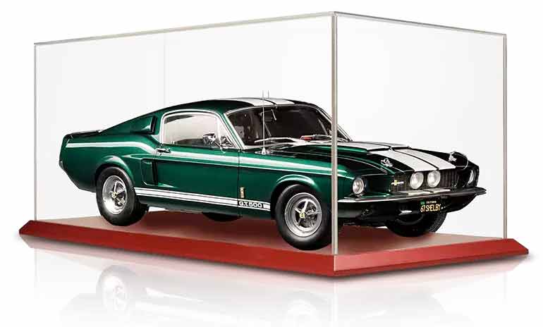 Soyons francs, rares sont les vitrines à pouvoir accueillir une voiture miniature à l’échelle 1/6, longue de 79 centimètres. Pourtant, un tel modèle doit être préservé de la poussière. C’est pour cette raison que les éditions Altaya proposent une offre Premium. Moyennant un surcoût de 1,50 € par numéro à partir du quatrième, vous pourrez recevoir cette élégante boîte vitrine de grande taille pour exposer votre Shelby GT500 au 1/6. Celle-ci mesure 91 centimètres de long, pour 41 de large et 28 de haut. Le coût de revient final de cette vitrine est alors de 190,50 €. C’est relativement cher mais gardez à l’esprit que les vitrines sont souvent très onéreuses. L’envoi est alors intégré avec la vingt-sixième expédition de cette maquette.