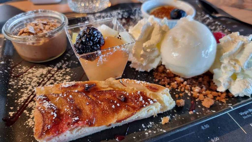 Pour le dessert, cinq sont au choix ainsi que différentes glaces. Thomas est parti sur un grand classique : la Dama Bianco. Trois boules de vanille, sauce chocolat, crème fouettée : une valeur sûre. L’assiette de gourmandises que j’ai choisie est aussi une bonne surprise. Là encore, la présentation est une pure réussite. Cela met bien en appétit mais nous sommes bien rassasiés.