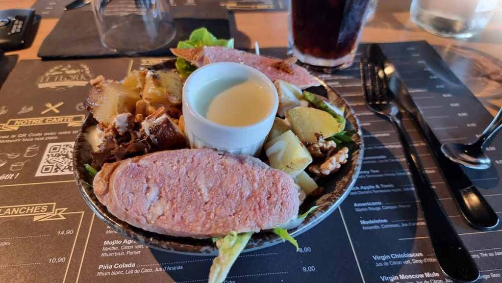 La carte du restaurant Florio est relativement restreinte, ce qui permet aux équipes de favoriser le fait-maison et de travailler des produits frais et locaux. Dans notre cas, Thomas (Heuzé-Maurice) et moi-même (Thomas Drouart) avons opté, pour l’entrée pour une salade Franc comtoise. Une valeur sûre qui comprend salade, pommes de terre rissolées, du gruyère, des noix, des oignons frits, de la saucisse chevillée et de la cancoillotte (une spécialité fromagère de la région).
