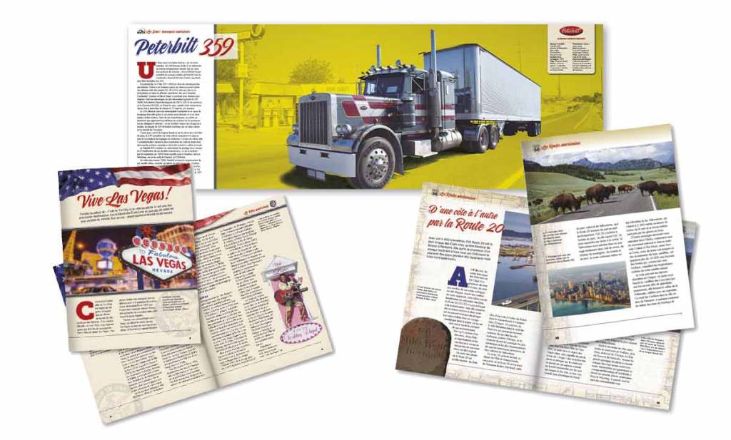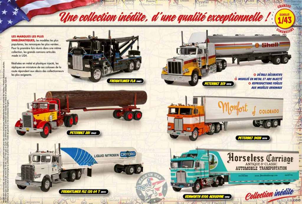 - Les semi-remorques Américains : cette rubrique comprend un spectaculaire dépliant consacré au camion qui est le héros de chaque fascicule – et fait l’objet d’une fiche technique détaillée ;