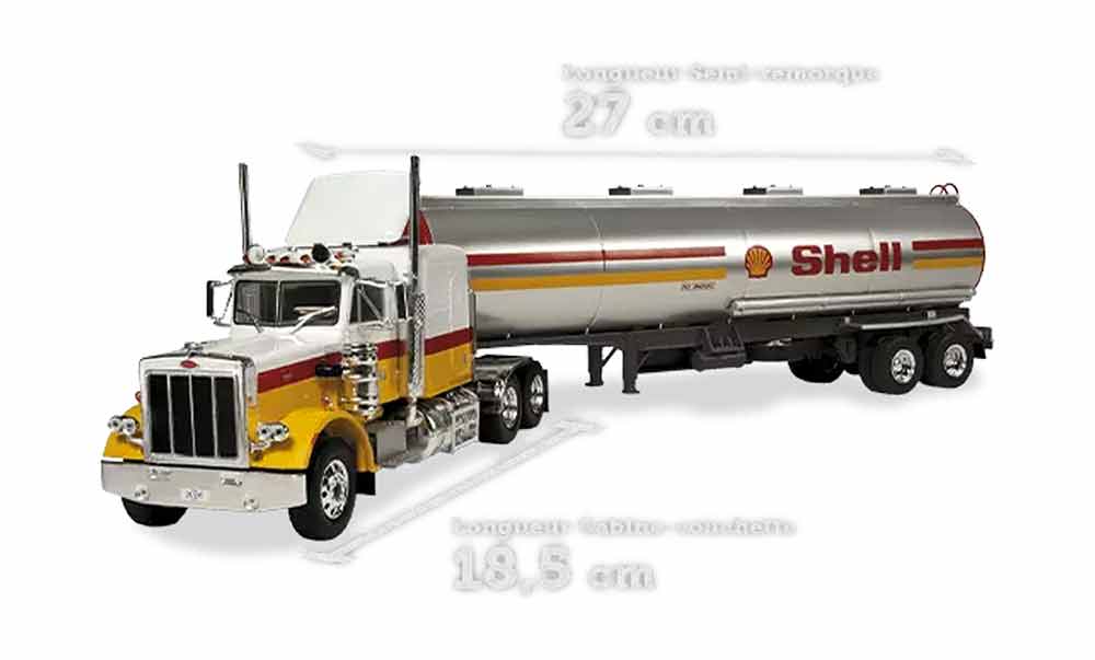 Le premier numéro de la collection demeure un joli Peterbilt 359 de la fin des années ’60. Celui-ci accueille une semi-remorque surmontée d’une citerne. Ce bel ensemble au 1/43 est aux couleurs de Shell. Un demi-siècle après, le 359 est toujours un modèle mythique américain, cher dans le cœur des passionnés. La partie tracteur mesure 18,5 centimètres de long et la semi-remorque pas moins de 27 centimètres. Ce bel ensemble est vendu au prix de 6,99 €. Un prix de lancement très séduisant qui devrait inciter pas mal de monde à découvrir plus en détails cette belle collection Altaya 1/43. Ce semi-remorque Américain est accompagné d’un fascicule de 16 pages qui parle du rêve Américain, des camions aux États-Unis et diverses anecdotes sur les routes Américaines.
