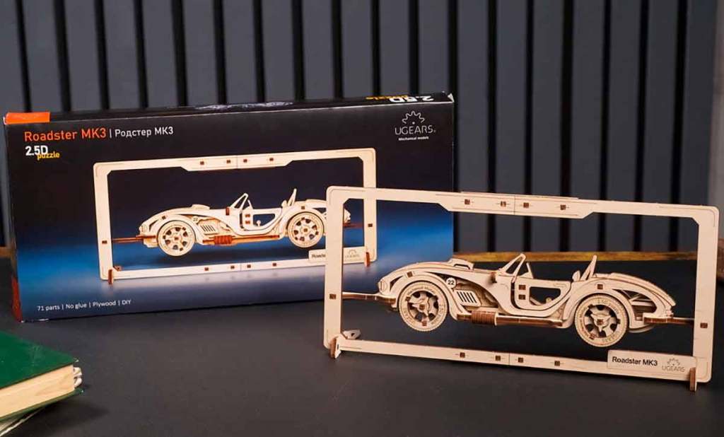 Pour ses cadres 2,5D, Ugears Models a conservé son mode de construction habituel. Chaque boîte comporte donc plusieurs planches fines en bois, dans lesquelles ont été découpées au laser, les différentes pièces. Vous devrez alors, notice à l’appui, détacher les pièces puis les assembler méticuleusement. Ces cadres sont donc en volume, ce qui permet de préserver quelques fonctions mécaniques. Dans le cas du roadster mk3, on peut, par exemple, ouvrir les portes, faire tourner les roues et actionner le levier de vitesse. Le tout est joliment présenté dans un cadre. Vous pourrez alors poser votre modèle sur une étagère ou bien même l’accrocher au mur. Nul doute que les collectionneurs de modèles Ugears y trouveront rapidement leur compte !