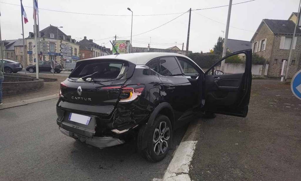 Derrière nous, un semi-remorque tracté par un joli Scania R500 blanc. Cela fait plusieurs centaines de mètres déjà que ce poids-lourd est derrière nous. Je remarquais justement à quel point ce bel ensemble gardait bien ses distances de sécurité, ce qui était plutôt rassurant car avoir cette énorme masse dans le rétroviseur, c’est justement assez peu rassurant. Le lourd véhicule prend la même direction que nous, aborde l’embranchement (avec son clignotant) sauf qu’une courte seconde d’inattention sera lourde de conséquences… L’avant gauche du tracteur Scania vient lourdement percuter notre Renault Captur au niveau de l’arrière droit. Malgré mon pied sur le frein en attendant de pouvoir m’engager, nous avançons de cinq mètres…