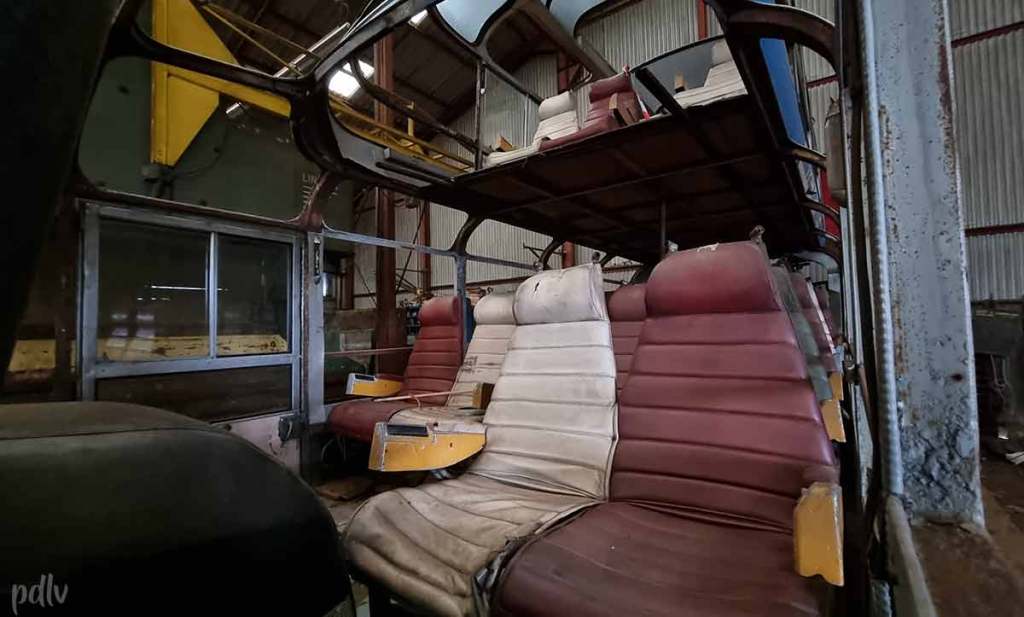 L’intérieur baigne de lumière, surtout si la partie supérieure du toit a été reculée, afin d’en faire un autocar partiellement découvrable ! Ce car n’est d’ailleurs pas le plus capacitaire mais il offre un habitacle très agréable et une ambiance un peu hors du temps. Bien sûr, sur les photos, ce Citroën U55 Cityrama a perdu de sa superbe mais il a le mérite d’être complet et d’offrir un regard délicieusement rétro. Sur les sièges du premier rang, à l’étage, la vue est parfaitement dégagée. Nous avons particulièrement hâte que la restauration de cet autocar de prestige, unique survivant, débute.