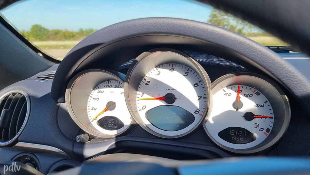 Le levier de vitesses tombe parfaitement sous la main. La console centrale dispose de nombreuses commandes physiques et fait l’impasse sur un écran central. N’oublions pas que nous sommes sur une voiture de 2006 ! Le tout est très élégant et correspond pleinement aux standards de la marque. La position de conduite est d’ailleurs très agréable. On est assez proches du sol mais le confort est malgré tout très bon. Bref, on se sent vraiment bien ! Il ne reste plus qu’à décapoter pour profiter du soleil ! C’est là tout l’intérêt d’un cabriolet ! La clé s’insère à gauche. Un premier tour de clé puis un second et la magie opère : le flat-6 se met en éveil. Une sonorité très agréable à froid…