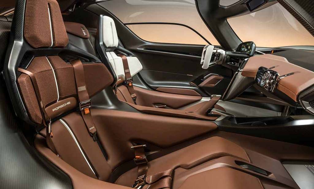 Une hypercar, ça s’apprécie pour ses moteurs, ses performances, son design mais aussi pour son intérieur. Sans surprise, Porsche n’y a pas été de main morte. On découvre des sièges baquets au design très travaillé, avec des habillages marron. Le siège conducteur dispose d’une partie supérieure blanche tandis que le volant, façon F1, est lui aussi bordé de blanc. Les commandes ont été largement réduites tandis que la fibre de carbone est omniprésente. On notera que les sièges reposent sur une structure en PRFC, qui est un plastique renforcé de carbone, qui assure solidité et légèreté. On notera aussi les harnais à six points et la position de conduite qui semble délicieusement enveloppante. Tout ça donne vraiment envie de prendre le volant…