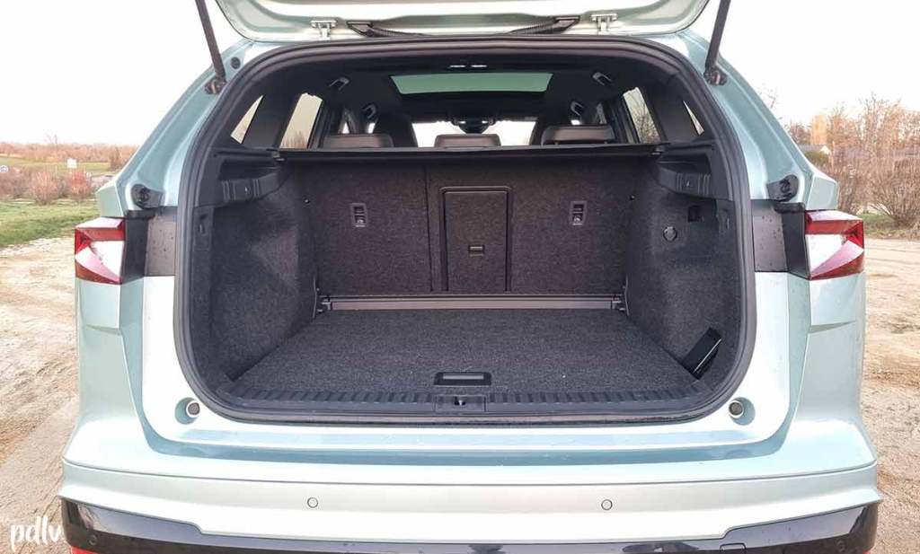 Avant tout, le Skoda Enyaq se positionne comme un SUV familial, un segment très prisé par les familles. Long de 4,65 mètres, c’est donc un gabarit dans la fourchette plutôt haute mais qui se cantonne à offrir cinq places seulement. Chez Skoda, pour voyager à sept, il faut faire le choix du Kodiaq. Mais surtout, l’Enyaq nourrit de fortes ambitions pour la marque, qui dispose de tout l’attirail pour développer rapidement une offre électrique. Les plus observateurs noteront que tous les SUV Skoda se terminent par la lettre « Q ». Je ne sais pas quoi faire de cette information, mais il m’a semblé bon de vous la partager. La vocation familiale de l’Enyaq est indéniable d’autant plus que ce SUV multiplie les bonnes idées à bord pour rendre à la vie à bord plus agréable. Il propose notamment un volume de coffre de 585 litres, idéal pour les excursions en famille.