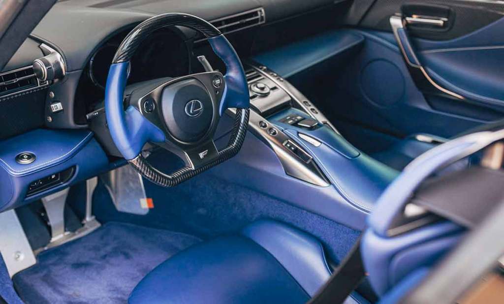 Derrière ce design affirmé, on trouve un certain degré de raffinement à bord. Déjà, chacun des 500 heureux acheteurs de Lexus LFA pouvait configurer l’intérieur comme il le souhaitait, en choisissant les tons qui lui plaisent. L’exemplaire ici illustré sera prochainement proposé aux enchères. Il s’agit de l’exemplaire 211, commandé en juin 2013 par un habitant du Qatar avant de rejoindre la Suisse en juillet 2021. Si la couleur extérieure est plutôt classique, l’habitacle se démarque par une dominante bleue. À bord, ce cuir bleu est omniprésent. Il compose harmonieusement avec une moquette bleue aussi et des touches de carbone et d’aluminium. Le niveau de finition est très poussé tandis que toute l’instrumentation est concentrée dans un écran à cristaux liquides, derrière le volant. L’écran central de 7 pouces permet de gérer la climatisation, le divertissement et le GPS.
