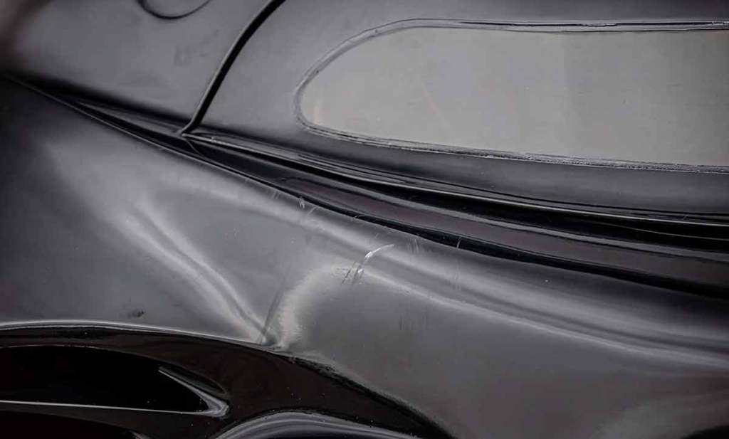 Il est assez difficile d’estimer la date de création de cette réplique de Batmobile. Toujours est-il qu’au fil des années, la belle s’est abîmée et nécessite aujourd’hui quelques travaux pour retrouver son éclat. Les joints de vitres sont usés, tandis que la peinture montre des irrégularités par endroit, comme des frottements, des rayures ou un écaillement du vernis. Les tubes du châssis sont également rouillés (mais pas perforés visiblement). Bonhams précise également que le pneu avant gauche se dégonfle. Pour le reste, la base semble très intéressante ! À bord, on trouve deux sièges qui semblent très bien conservés, tout comme les moquettes. Seule la jonction de l’assise et du dossier sera à faire reprendre par un sellier.