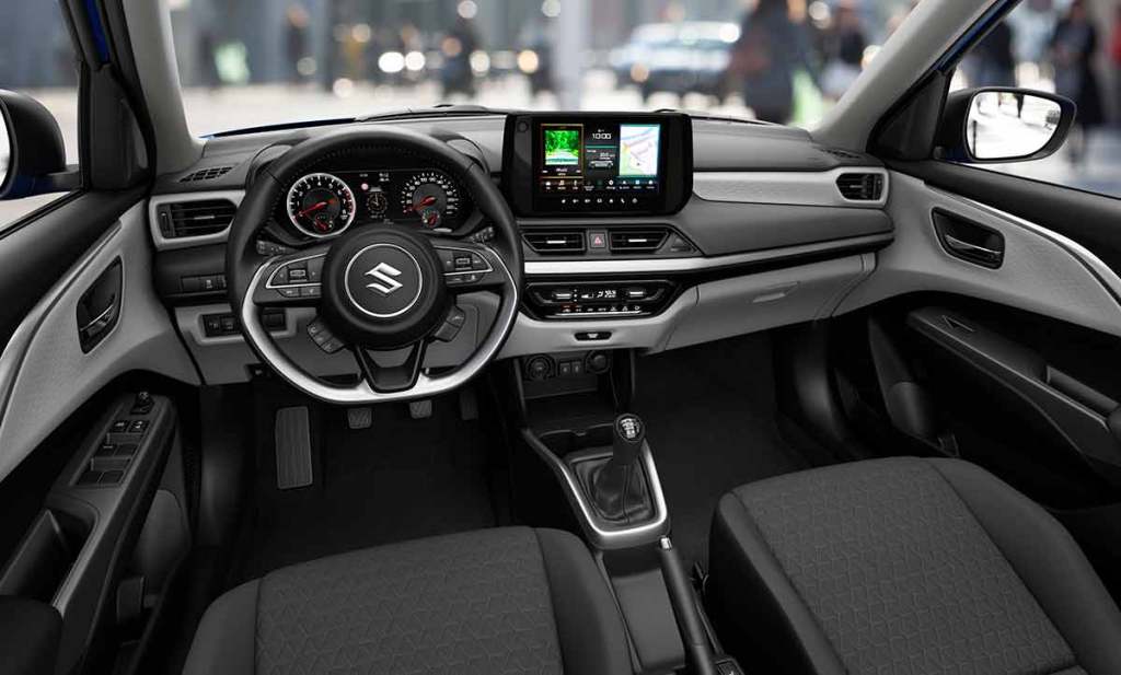 L’intérieur de la nouvelle Suzuki Swift s’identifie tout d’abord à son écran HD de 9 pouces, plus rectangulaire. Il prend en charge Apple CarPlay et Android Auto sans fil. Le dessin de la planche de bord s’affine sans se réinventer pour autant. Alors que c’est devenu la norme, l’instrumentation demeure « classique ». On trouve toujours des compteurs à aiguilles avec un petit écran central. Une conception plus simple qui pourrait permettre de faire la différence en matière de positionnement tarifaire. Pour le reste, pas de révolution à attendre de ce nouvel intérieur.