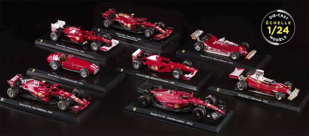 Pour aller encore plus loin dans la collection, vous pouvez choisir d’avoir trois voitures supplémentaires, à savoir les Ferrari SF-1000 (2020), Ferrari F1-75 (2022) et Ferrari SF23 (2023) en miniature. Toutefois, ces dernières sont à l’échelle 1/18 et non pas au 1/24 comme le reste de la collection. Certains modèles sont même des doublons… Cette offre Premium est donc facultative. Si vous la choisissez, un supplément de 3 € par numéro sera appliqué à partir du quatrième. Le prix de revient est donc de 231 € pour ces 3 miniatures. Objectivement, nous ne conseillons pas nécessairement de choisir cette offre, d’autant plus que l’échelle proposée est différente du restant de la collection.