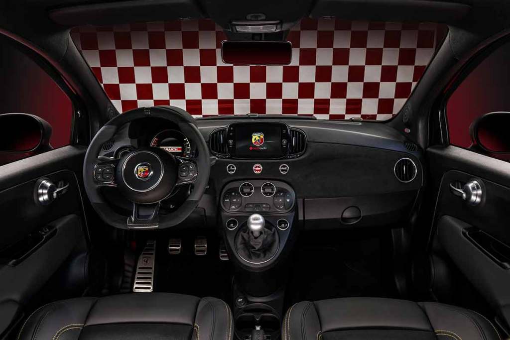 Cette nouvelle déclinaison de l’Abarth 695 se démarque aussi par sa planche de bord, désormais habillée d’alcantara noir. Le rendu semble vraiment cool. L’instrumentation accuse un petit peu le poids des années mais le côté faussement rétro reste correct. Le petit écran de 7 pouces demeure. Bien que dépassé, il ne pouvait pas faire l’objet d’un nouveau développement pour une petite série limitée… Quant aux baquets Sabelt, ils sont en carbone et sont partiellement recouverts de cuir. On appréciera les surpiqûres jaunes et le brodage du nom de cette édition limitée sur la partie basse des appuis-têtes. Une ambiance assez sportive donc. Fait amusant : on retrouvera naturellement le petit pommeau de vitesses entièrement rond.