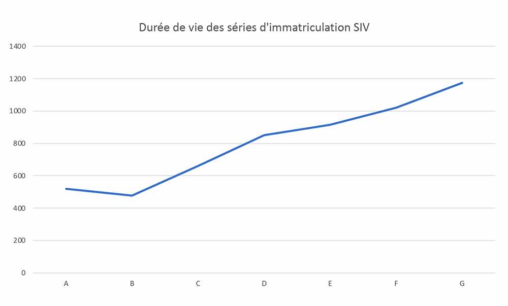 À la vue du contexte, il semble assez illusoire d’espérer une croissance exponentielle pour le marché des véhicules neufs. De plus, la mise en veille du leasing social a toutes les chances de calmer le marché. Nous sommes donc actuellement sur un rythme de défilement de près de 3 ans par série. Sachant que les lettres I, O et U ne seront pas attribuées, on peut imaginer que le SIV soit capable de tenir encore 48 ans, si les volumes de vente demeurent stables. La durée de vie totale du système serait alors de 63 ans. Mais cela n’est que purement théorique.