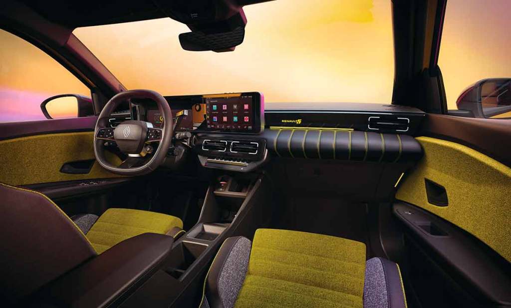 On trouve bien sûr l’interface numérique OpenR Link, agrémenté d’un assistant virtuel, nommé Reno, qui prend la forme d’un petit avatar. Celui-ci est associé aux services de ChatGPT. La reconnaissance vocale est aussi disponible. La finition haute, ici illustrée, donne aussi accès à une ambiance intérieure colorée. Le tout offre un visuel très attrayant. On appréciera aussi le revêtement en tissu gris, délicieusement rétro. Les commandes de boîte sont désormais incluses derrière le volant. On notera aussi que la partie basse est plus traditionnelle. On y trouve tout de même un chargeur de smartphone à induction. Aussi, les commandes physiques ont été maintenues au maximum. Par exemple, on pourra régler le volume sonore depuis le volant ou bien en utilisant des boutons situés sur l’écran central. Cela rappellera des souvenirs à certains !