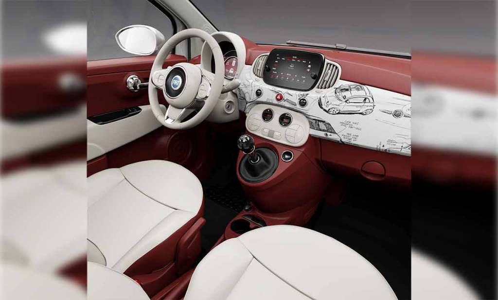 L’intérieur est assez remarquable. SI l’on retrouve les composants habituels de la Fiat 500 Hybrid toujours au catalogue, on découvre un habitacle dont les plastiques sont désormais rouges. Un rouge qui tire délicieusement vers le bordeaux et qui ajoute une touche rétro. Les sièges s’habillent, pour la partie supérieure, d’un cuir pleine fleur bicolore avec des logos brodés. Une présentation qui marche bien et qui crée une ambiance vraiment spécifique. Des esquisses sont même imprimées directement sur la planche de bord. Un bel hommage au concept de 2004. Il s’agit d’une reproduction des dessins originaux de Roberto Giolito.