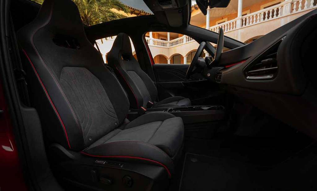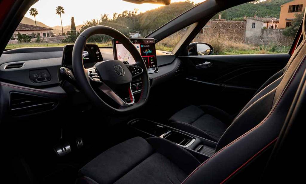 À bord de la Volkswagen ID.3 GTX, on trouve tout d’abord une belle sellerie. On découvre de jolis sièges semi-baquets Top Sport, proposés en option. Ils sont composés d’un revêtement en textile et d’ArtVelours. Ils disposent également de surpiqûres rouges, ce qui est la couleur de présentation de la gamme GTX. Pour plus de confort, il sera aussi possible de choisir des sièges ergoActive. Peu d’évolutions majeures dans cet habitacle mais on remarque l’intégration d’un écran plus grand, qui atteint désormais 12,9 pouces, contre 12,0 pouces sur les autres finitions. Volkswagen aurait également revu son interface numérique, s’appuyant notamment sur l’intelligence artificielle ChatGPT pour certaines fonctionnalités.