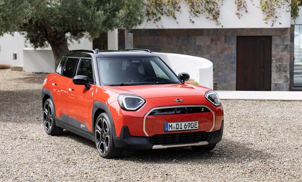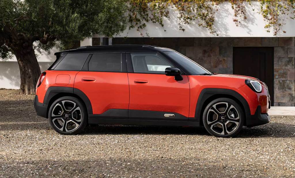 Visuellement, l’avant s’articule autour d’une large calandre suggérée par un contour chromé, évasé sur la partie basse. Le bouclier, principalement en plastique sur la partie basse, renforce le côté baroudeur. Les optiques avant disposent de trois signatures lumineuses au choix. Un design faussement strict avec des angles arrondis. Ça fonctionne plutôt bien ! Le profil, immédiatement reconnaissable, s’ouvre sur une ligne sobre et bien exécutée, sans arêtes saillantes. Le toit, noir, permet d’épurer la ligne tout en la dynamisant. On découvre aussi de nouvelles jantes, dont le diamètre varie entre 17 et 19 pouces. À l’arrière, trois choix également pour la signature lumineuse. Les feux ont un design superbe, avec un dégradé de tons. Pour le reste, les traits sont assez classiques chez Mini. Une belle gueule en somme !