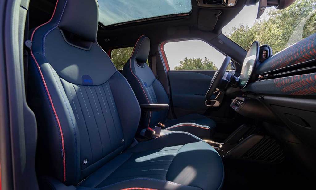 Sur ce modèle de présérie, on découvre une sellerie à dominante bleue. Cela jure un peu avec la carrosserie rouge mais cela démontre aussi qu’il y aura sans doute un large choix de teintes ! Et ça, c’est plutôt un incontournable pour une marque comme Mini, qui joue à fond la carte de la personnalisation.