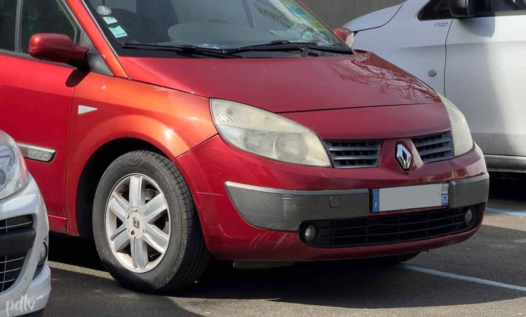 Terminons ces petits observations par un constat, qui touche principalement les Renault Scénic II phase 1, commercialisés entre 2003 et 2006. Contrairement aux autres éléments de carrosserie, les pare-chocs sont en plastique. J’ignore si la préparation (apprêt) est responsable de ce phénomène mais les boucliers ont généralement une teinte qui tient mieux que le capot ou les ailes. La conséquence directe, c’est qu’il y a une différence de couleur plus ou moins importante entre le pare-chocs et les panneaux adjacents. Cela se perçoit surtout sur les teintes colorées. Dans certains cas, c’est une remise en peinture du pare-chocs qui est responsable du phénomène mais ce n’est pas systématique…